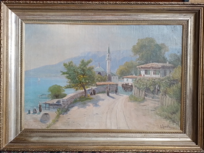 Idyllic genre view of the busy Crimea of the late 19th century with the vineyard mosque and the sea. The picture fits seamlessly into the tradition of Russian landscape and marine painting of the late 19th century, which was strongly influenced by romantic and realistic trends. During his time as a student in Sgt. Petersburg, Alisov was a student of Julius von Klever at the Academy of Fine Arts and later he was inspired and trained by the works of Ivan Aivazovsky, which is clearly reflected in his work.