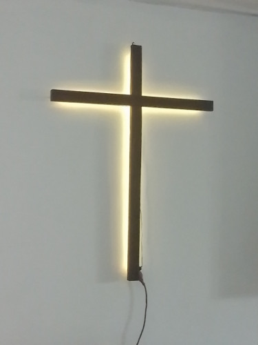 Kreuz in Mooreiche für Gemeindesaal beleutet .