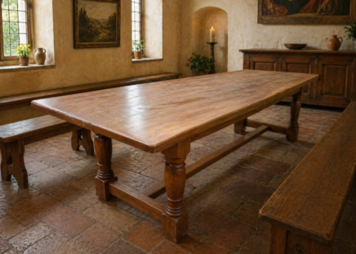 Mit seinen großzügigen Maßen von 285 × 90 × 78 cm bietet der Tisch ausreichend Platz für gesellige Runden und repräsentative Tafeln. Ursprünglich diente der Refektoriumstisch als zentraler Ort gemeinschaftlicher Mahlzeiten in klösterlichen Speisesälen – den sogenannten Refektorien. Diese Tische waren bewusst robust konstruiert, um den täglichen Anforderungen einer großen Gemeinschaft standzuhalten, und zugleich schlicht gestaltet, um Bescheidenheit und Funktionalität zu betonen. Im Laufe der Jahrhunderte fanden ähnliche Tischformen auch Eingang in bäuerliche und später bürgerliche Haushalte.